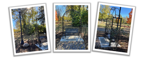 The bench and arbor allow for a resting place for visitors with views of the cemetery, memorial garden and White River.